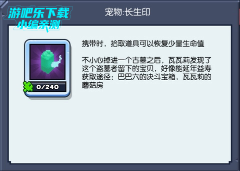 这是瓦瓦莉在不小心掉进一个古墓之中后,无意中发现的,是一个盗墓者留下的宝贝,从其散发的看,好像具有延年益寿的效果,虽然不知真假,但是携带后,的确能在拾取道具的同时恢复少量生命值,这无疑大大加强了在蘑菇岛中生存的几率。