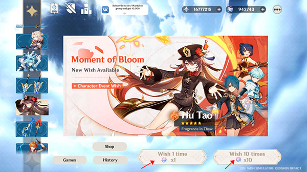 1、打开原神愿望模拟器中文版,进入游戏主界面,游戏模拟了原神单抽和十连两种抽卡方式,