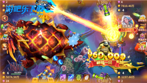 房间特色:该场景最小的炮台倍数为30倍,BOSS从普通的大海怪升级为黄金大海怪,掉落金币也有大幅度增加!同时,新增的冰霜巨龙和烈焰巨龙两个BOSS霸气十足,率先击杀BOSS的玩家头上会出现酷炫特效!不仅如此,房间内开放了更多新颖的任务,例如:可一网打尽的鱼群、银雷龙、恶魔箱子、海盗悬赏,每次完成任务,都会出现全屏特效,把大把金币和钻石吸入囊中。