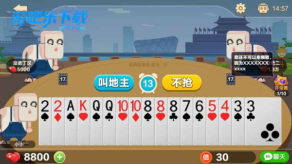 叫地主:随机选择一个玩家开始依次叫分,玩家可以选择叫 “1 分”“2 分” 或者不叫分,所叫的分数必须比上一家高。当有玩家叫 “3 分” 时,立即结束叫分,抢到 “3 分” 的玩家为本局地主;如果没有玩家叫 “3 分”,则叫分最高的玩家为本局地主。
