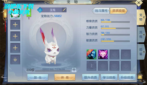 出战的宠物与角色一同战斗时,会获得经验。也可以使用经验道具,为宠物提供经验。通过资质提升、学习技能、升级技能可以提升宠物的属性。通过洗炼,可以改变宠物的属性和品质。