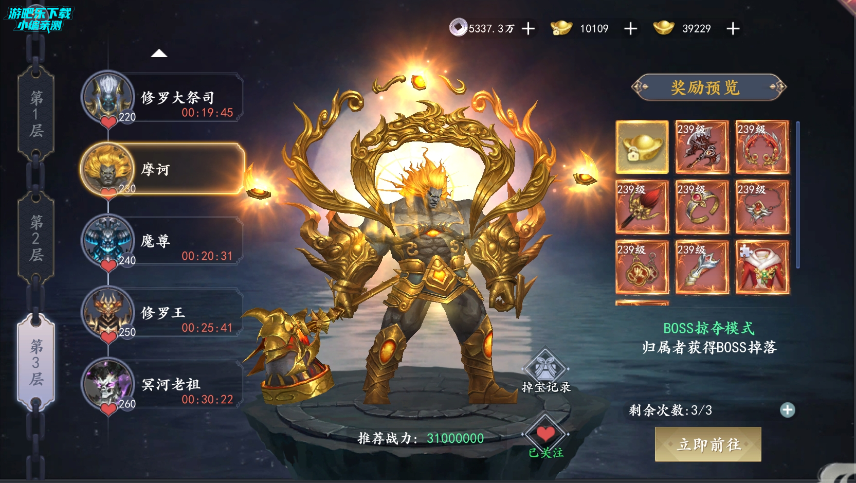 共设三层,根据角色战力可自由选择挑战难度。越高层的BOSS,掉落的极品装备越丰厚!