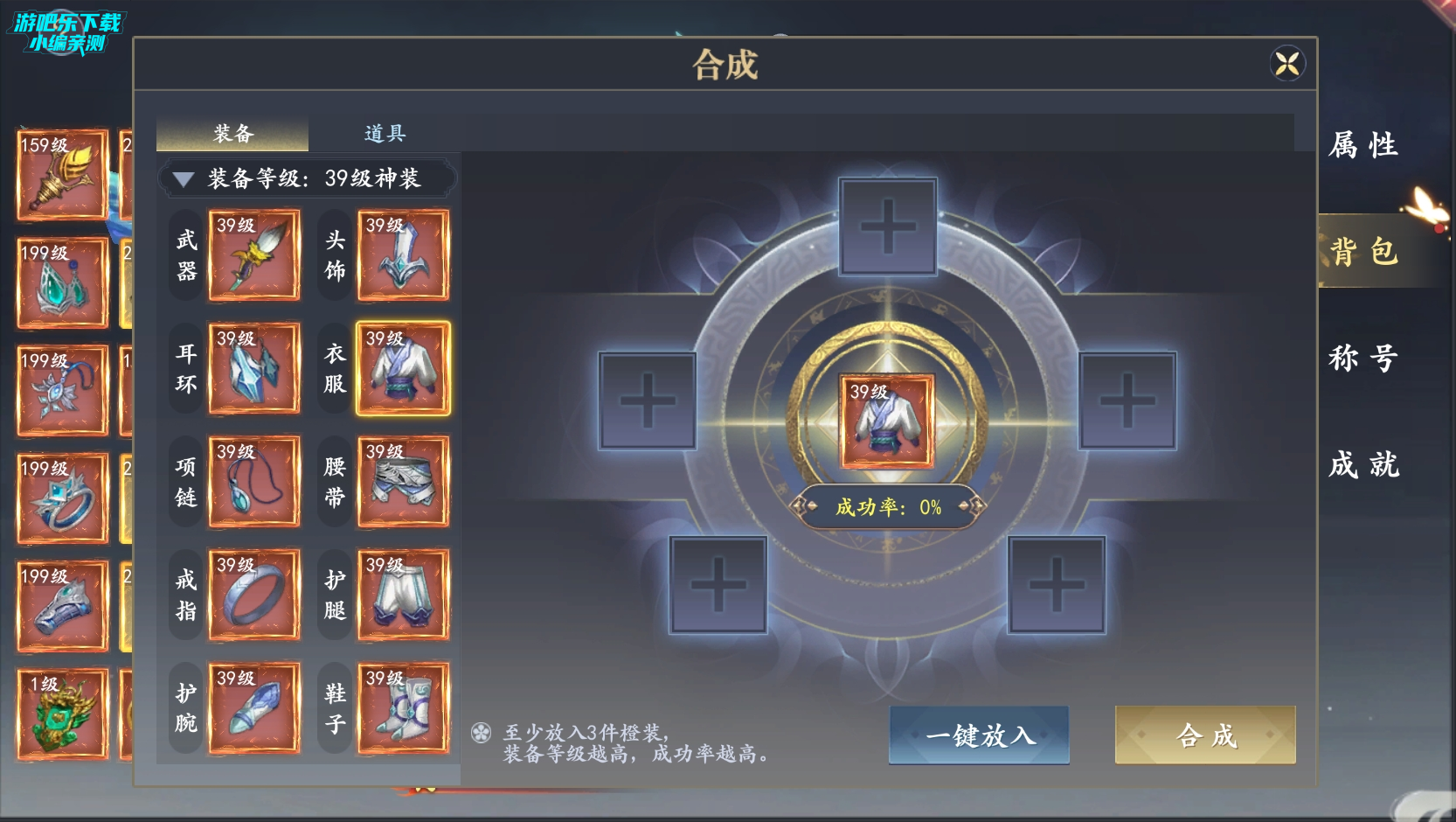 多余的橙装不要急着分解,可在“背包-合成”界面中融合升级,轻松获得更高品质装备。