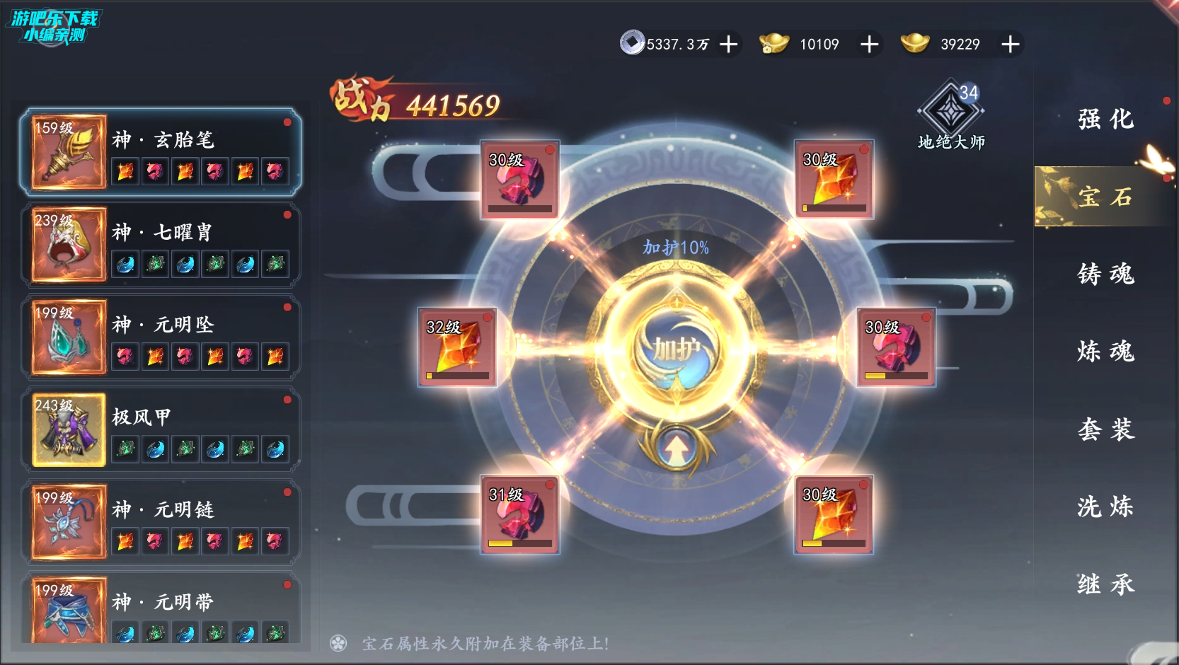 宝石是最直接的战力跃升方式。宝石孔位随等级开放,宝石可通过挖宝图、活动商城或商店购买获得。