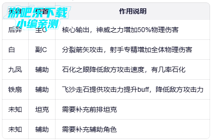 阵容特点:纯物理输出阵容,后羿为主核心,白为次输出,九凤和铁扇为辅助,适合后期高难度挑战。