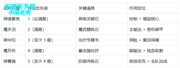 阵容构成:神诸葛亮(后排辅助)+ 魔关羽(前排输出)+ 神华佗(后排治疗)+ 魔吕布(中排输出)+ 神曹操(前排坦克)