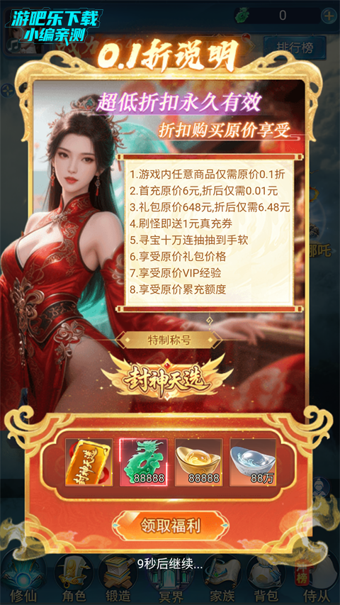 ★后缀福利说明:(1)游戏内充值永久0.1折(2)闯关连送十万抽(3)首充立得1000个648