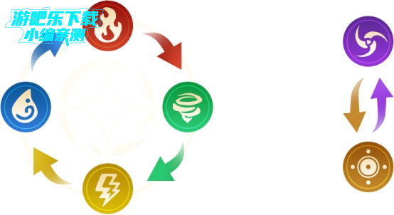 共有六种属性,其属性分别为:水、火、风、雷和天道、混沌六种,水、火、风、雷四种属性形成循环克制,天道、混沌为互相克制。
