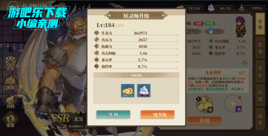 妖灵师可以通过消耗升级材料(妖晶币、龙元灵液)提升等级,而升级可以提升面板属性,当达到等级上限时可以通过消耗妖晶币、龙元灵液和九转丹进阶等级上限。不过前期资源有限,还是尽量避免将养成材料分散给太多角色,练好一队主力队伍能过主线才是最重要的。