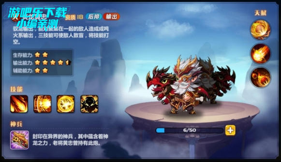炎龙黄忠:拥有火属性大范围多次爆炸伤害,7星还会增加一倍的爆炸范围,并且有80%的概率不消耗旋风状态,小技能穿甲弹破甲,闪光弹致盲,致盲期间所有攻击都会被闪避,技能机制完美适配孙策,攻击模组很差,pve伤害略高于哪吒,pvp不如哪吒,考虑到培养成本,黄忠和郭嘉只推荐养其中一个