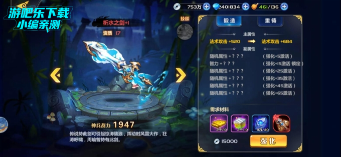 神兵选择系统推荐的就好,有羁绊加成,锻造方面如图所示建议优先强化到45级就可以了性价比高