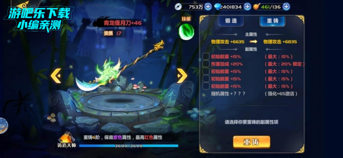 重铸满级有6条第2条是固定的,词条选择方面初始能量>攻击速度>伤害加成=伤害减免>暴击=爆伤=暴击抵抗=暴击减伤>物/法攻击>生命加成=物/法防御
