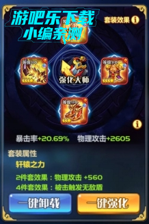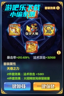 宝物以红色套装举例,天尊,轩辕这种属于输出类型的给c穿的,天尊是+法术,轩辕是+物理,其他三个词条都是暴击爆伤伤害加成,随便点开一个武将技能,可以看到是法术伤害还是物理伤害,例如哪吒是法术就穿天尊,关羽是物理就穿轩辕,蚩尤是给前排抗伤或辅助角色穿的,不需要他打多高的输出,例如孙策,吕蒙等都可以穿蚩尤,套装建议优先第一队5个人先各拿一套以后再升星,升星可以增加套装效果