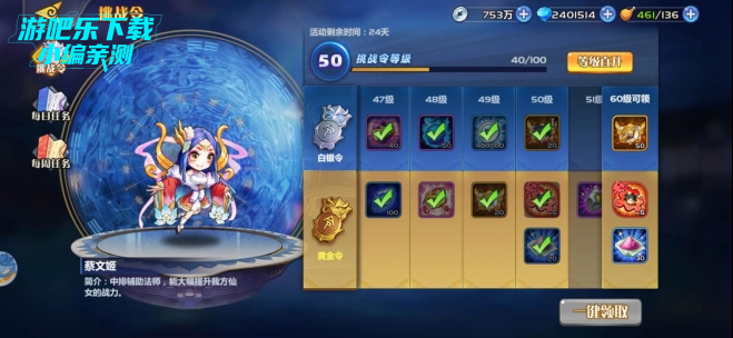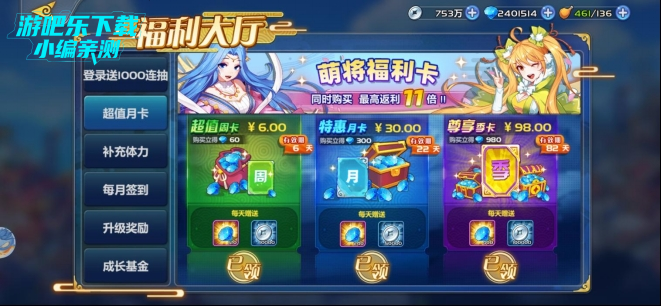 这个是必拿的游戏内性价比最高的,百分比提升所有武将的基础属性,每日奖励有万能碎片,宝石,体力等大量培养资源,激活奖励有吕布,猴子,司马懿三张资质17的武将以及对应皮肤,前期开荒就可以用这三个再搭两个资质16的武将