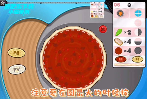 2、注意要在虚线圈范围最大的时候再点击酱料,这样会全铺在披萨饼上。
