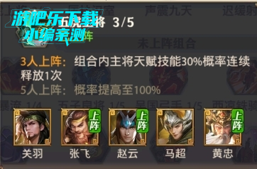 黄忠搭配张飞,刘备,赵云就可以凑齐五虎上将组合,三五虎上将会有30%的概率将天赋技能连续释放一次!