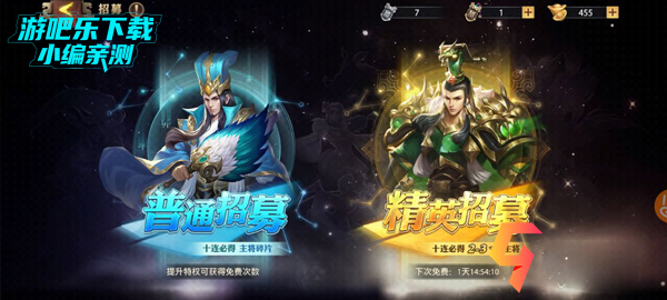 二、招募高星主将:招募时需要利用每日首次五折的优惠,这样就可以用最少的钱,抽更多次数的武将了。(精英招募选择十连抽可必得三星主将)