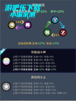 英雄分为空、Z、时、神、魔五个系。不同的搭配可激活多种全队属性加成,与编队中的属性类型和数量有关。