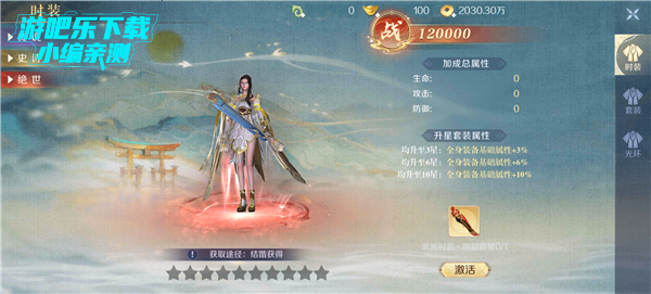 时装分为传说、史诗、绝世三等级,等级越高激活可带来的生命、攻击等属性加成越高。