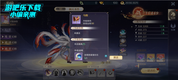 不同坐骑装备携带的属性不同,玩家激活可提升生命、攻击属性。