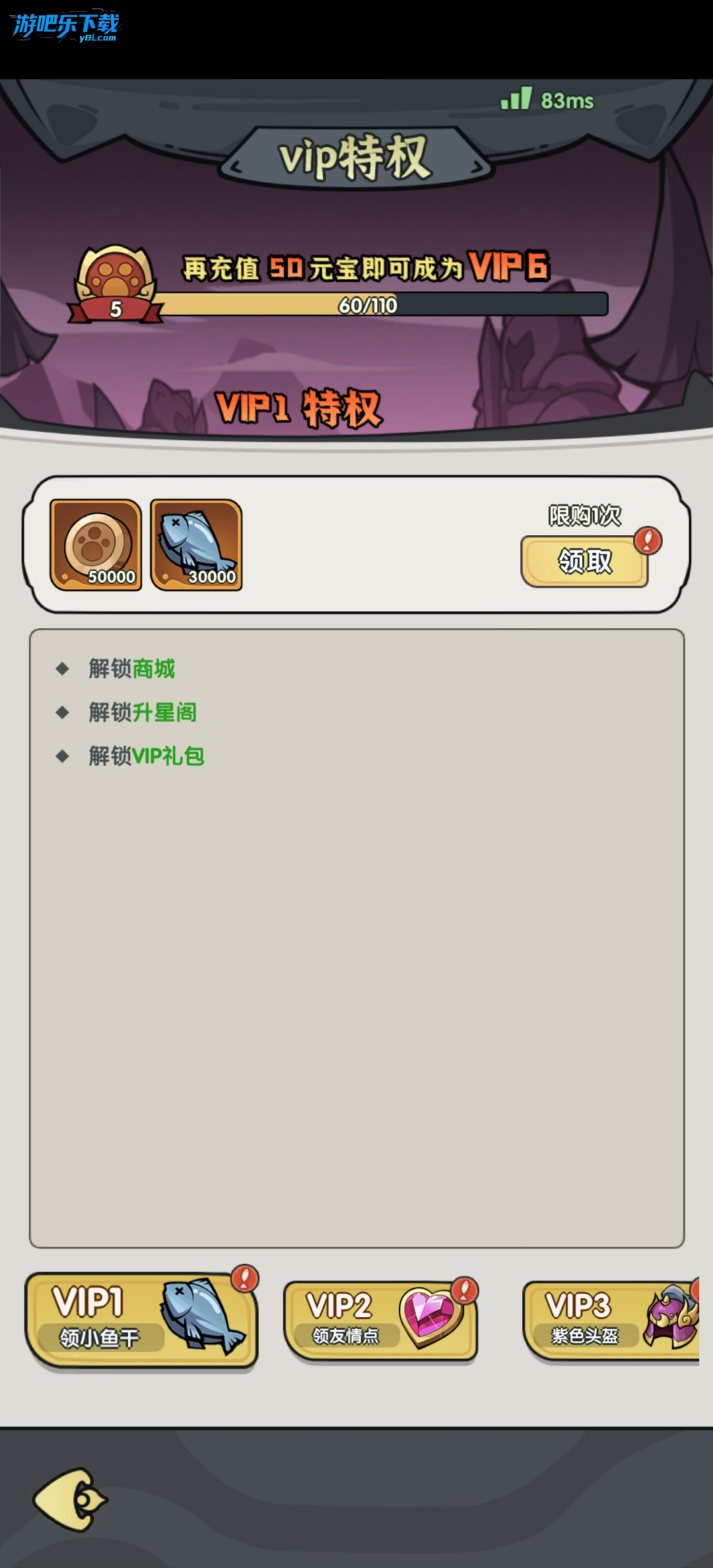 爬塔主要就是为了拿罐头用于咪将的升星非常重要,商店出现就要屯,元宝主要用来购买罐头和vip等级特权礼包