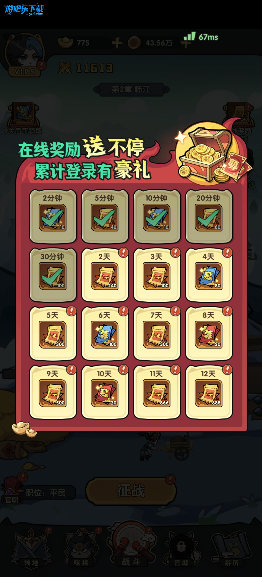 微氪:挂机特权68、招贤令30、98米开局顺便白嫖两张月卡(给2.4w元宝)
