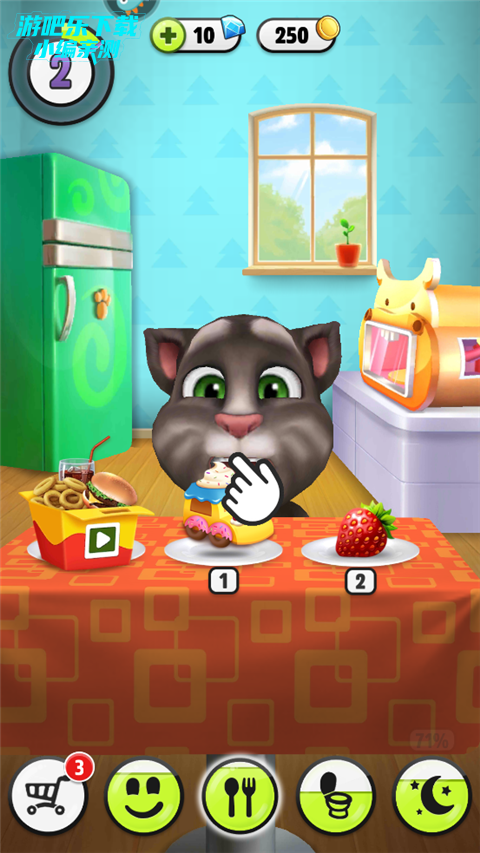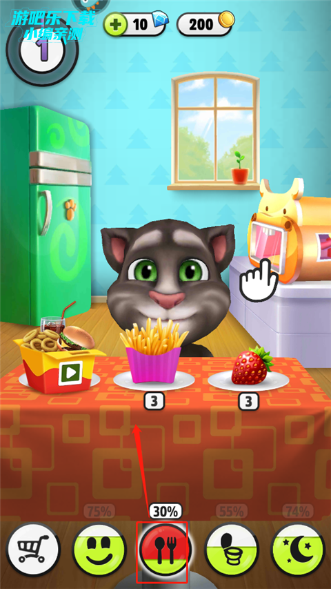 点击这个按键会带汤姆猫到餐厅,桌子上摆着的东西,玩家可以喂给我们汤姆哦。
