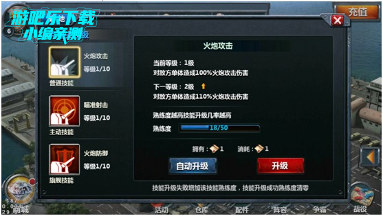 每艘舰船最多可有三个技能,其中普通攻击技能一个,主动攻击技能一个,旗舰技能一个(部分舰船无旗舰技能),所有类型的技能均可以进行升级。每个技能升级时消耗一定数量指定的道具,使用该道具后根据一定概率会有两种结果:技能升级成功、技能升级失败但熟练度增加