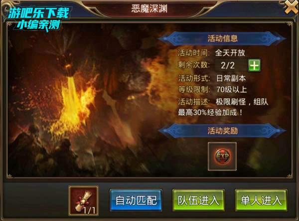 4、赏金任务每天必须完成,有大量的金币和经验;恶魔深渊更加是少不了(最好是在当天经验获得的任务都完成再打),它是经验获得最高的来源,建议组队一起打,有组队经验加成,同时最好能够进行鼓舞(如果是非R可以用金币鼓舞到50%,如果是土豪那么可以鼓舞到100%),经验丹也要吃(最好是2倍,没有的用1.5倍也行),打完恶魔深渊一般还要等3分钟左右才能再打下一次,这个时候可以去做一下单人副本或者直接挂机打怪,在经验丹的持续时间内把恶魔深渊都通关完。(当然啦,有钱的土豪可以提升vip等级增加购买次数)