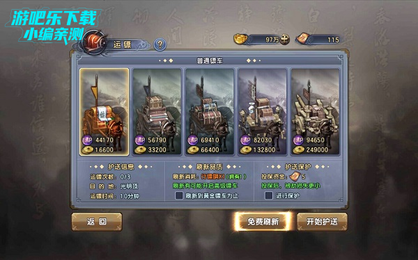 玩家在30级时可开启运镖系统,在大都找到NPC“宫九佳”即可开启任务。每人每天可完成3次运镖任务。每次完成后依据镖车品质不同,可以获得大量的铜币和经验奖励。每日活动获得的“行镖旗”此时就可以派上大用场了,可以刷新镖车品质,以便获得更高的利润。在这里强烈建议大家每次都刷新到黄金品质镖车再进行押运。最低等的普通镖车和最高档的橙色品质镖车所获得的报酬差距可不是一般的大呢。
