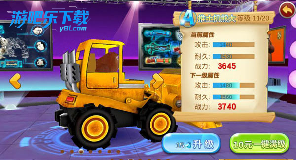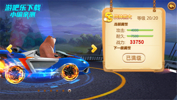 战神熊大作为陆地最强机甲,其满级的强力属性当然不用多说了,满级之后33750的超强战力让其他机甲都望而却步。满级之后4000攻击+7500的耐久让玩家在关卡中可以走的更加长远,赛车形态酷炫的外形和机甲形态的威武形象,让玩家通过点击即可轻松转换。