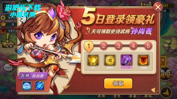 新角色只需要连续5天登陆就赠送史实武将孙尚香,不容错过的美女名将!除了通过纳贤外,还可以通过VIP等级、每日任务、每天签到、竞技场和精英关卡兑换获得武魂来合成武将