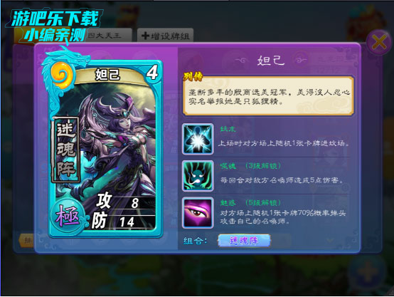 首先,要说的就是妲己。有苏氏部落之女,商纣王之妃,传说妲己是个蛇蝎美人,貌美如花而妖颜惑众。《神话》手游中的妲己,作为4费橙卡,带有妖术、噬魂、魅惑三个技能,妖术将对方卡牌送进坟场,魅惑使对方卡牌攻击自己召唤师,而噬魂则直接攻击召唤师造伤害,如此看来确实是妖之首。