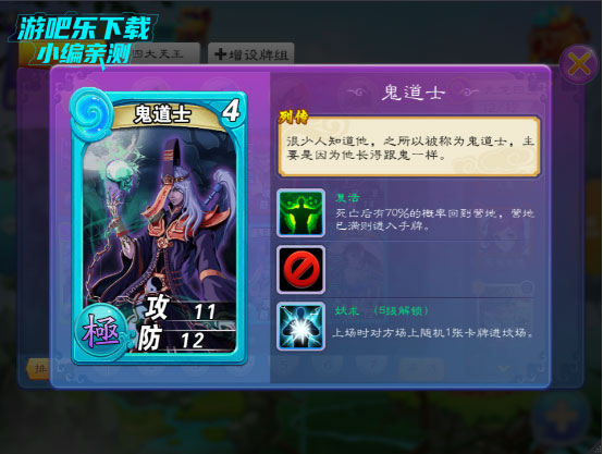 最后要说一下前期最喜欢的一张卡:鬼道士。不知从何来,不知去何处,很少人知道他,上场妖术送对方卡牌进坟场,即使死亡,复活的技能使这张卡牌有70%的概率回到营地,下次上场继续妖术直至进入坟场。