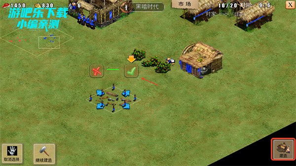 1、建造技巧:选择农民后点击“建造”,选择建筑类型并放置空地,确定后开始建造。