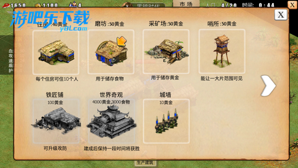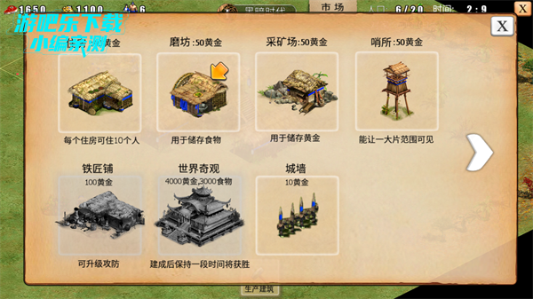 2、建筑优先级:初期集中农民建造城堡(生产特色兵种的核心建筑),同步建造攻防铺提升兵种属性,后期补充粮食仓和黄金仓缩短运输距离。