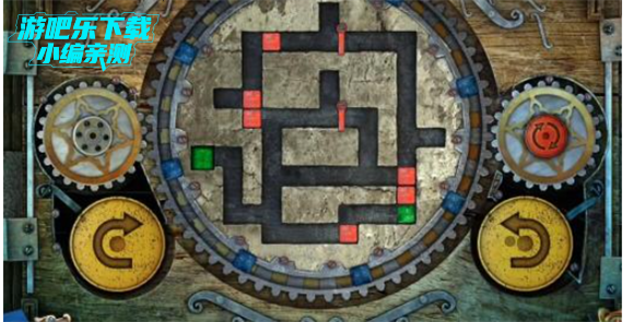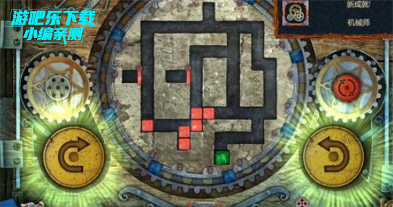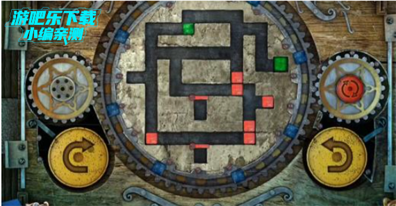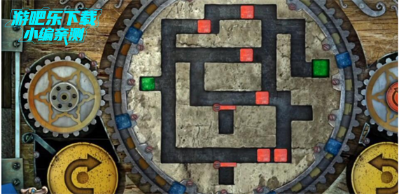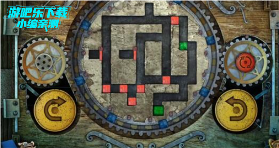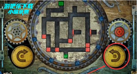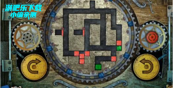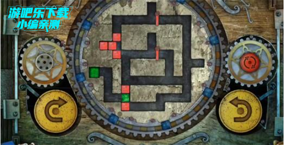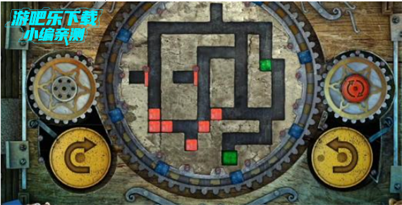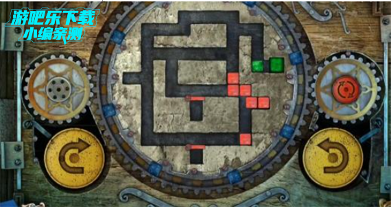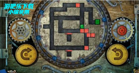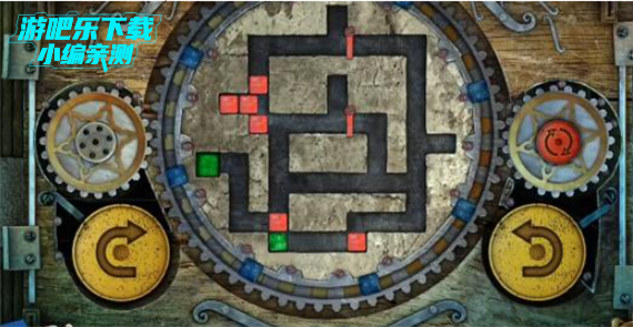 17、最后,点击左边黄色的旋转按钮一下,中间的大齿轮会顺时针旋转一次,旋转后的立方体位置如图,此时的绿色立方体已经进入了绿色的单元格内,即可通关,门就打开了。