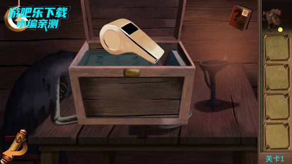 点击桌子上盒子,输入密码V、I、VII,打开得到哨子;
