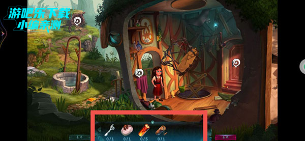 1、点击神奇的豆茎,得知需要魔法豆子、蓬松的云和长笛,点击右侧大树,得知需要青蛙,点击女孩旁边的小红花,得知需要森林仙子