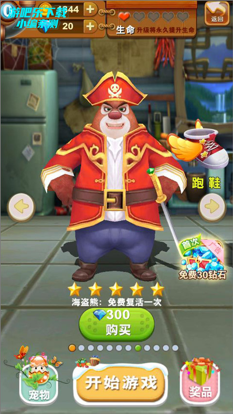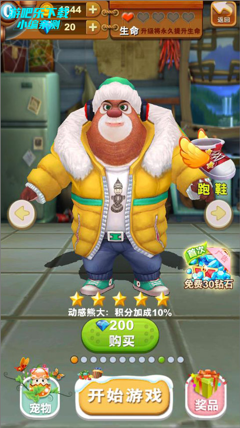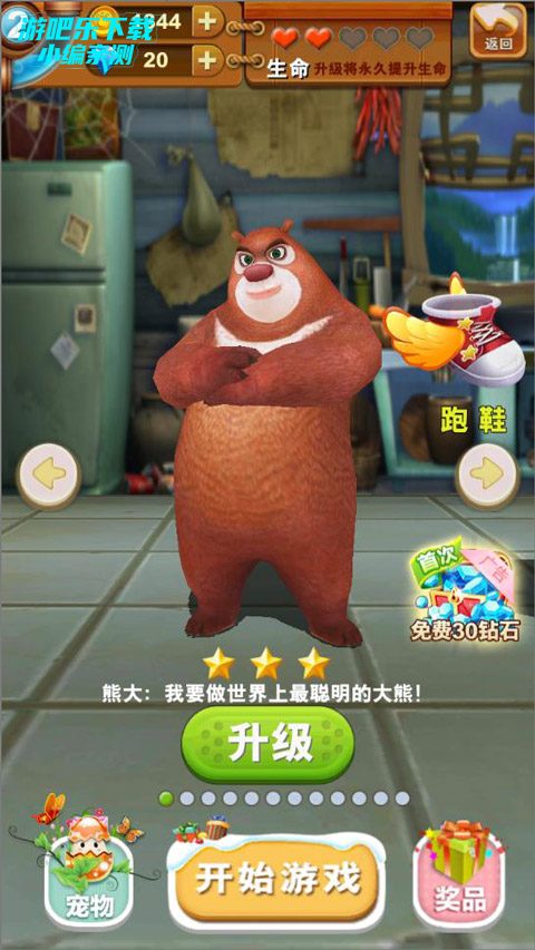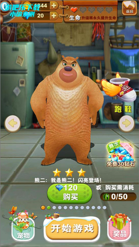 解锁条件:熊二是熊大的弟弟,需要120颗钻石或50个西瓜解锁。而西瓜的获得途径是多进行游戏,在游戏中随机获得西瓜奖励。