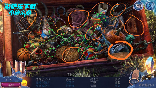 去果园,从门上拿到凿子,在鸟窝里得到烧烤夹子(两块拼成一块),回小屋,在水龙头下方用凿子得到注油器,开果园的门,得到挂锁,点开书后篮子,得到坚果钳。用烧烤夹子夹起曲柄,安上,把铁链弄到神兽旁边,用挂锁连接铁链和木板的环,把木板拖开,得到茶巾。