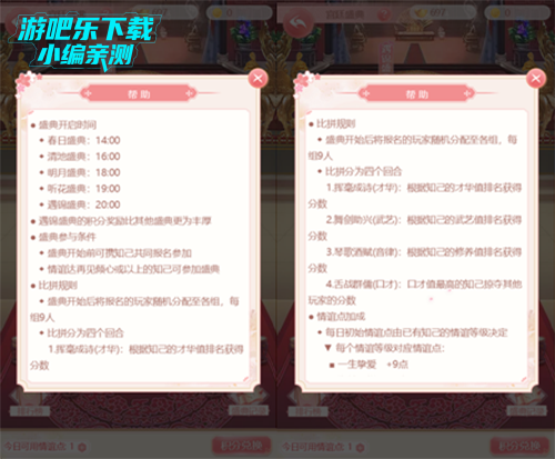 提升知己的情谊,可以提高小主的势力,同时也可以解锁乾清宫,参与宫廷盛典。每提升一位知己达到再见倾心,则可以多参加一场盛典,最高5场盛典,每场盛典开启时间都不同,小主可在盛典开始前,派遣知己参与,参与前可以分配情谊点,临时增加知己的属性。每场盛典比拼分为4个回合,分别比拼才华、武艺、音律、口才四项属性,其中才华、武艺、音律回合可获得分数,口才回合可以掠夺其他玩家分数!以最终分数作为排名依据,根据排名发放奖励。