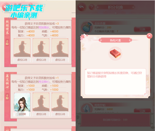 一封锦书寄相思,飞鸽传书是游戏的特色玩法之一,知己们不在身边怎么办?这时候就需要靠信鸽来传情达意~提升知己的亲密度之后,可以解锁话题,小主每次可以通过飞鸽传书与知己们展开话题剧情,根据小主的不同选择,剧情也会走向不同的结局。在一段甜蜜暧昧的剧情之后,可以提升知己的亲密经验以及知己的属性。