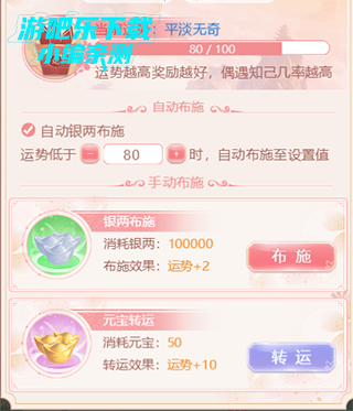 运势越高遇到知己几率越大,所以想要尽快的把知己都带走的话可以通过点击游玩左下角的【运势签】来提高当前的运势哦,布施可以使用银两+2点运势、另外还可以使用元宝转运使当前运势+10呢~此外在布施页面可以设置【自动布施】,勾选自动布施后会在每次游玩过后自动将运势补充至设定值。运势每15分钟恢复1点,且只能回复到90点。