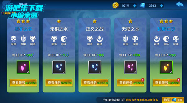 2、任务品质有1-5星,星级越高奖励越好,但任务所需时间越长。每日初始有5个任务,完成后需等一段时间来刷新出新任务。也可花费钻石直接购买任务,并且购买的任务大概率刷出高品质的任务