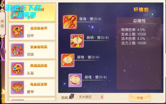 角色等级达到220级可开启神器,消耗神器材料可修复神器,大量增幅战,可优先升级。