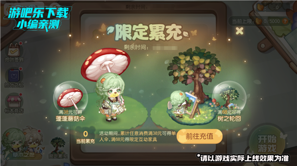 活动介绍:限定累充活动限时开启,在活动期间,在游戏内进行任意充值可累积充值额度。当累积充值额度达到对应的档位额度时,可点击领取对应档位的奖励。丰厚的奖励包括单人伞「蓬蓬蘑菇伞」、限定互动家具「树之轮回」,快来参与吧!
