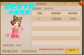 非王城争夺时间,各帮派的帮主和副帮主可以参与王城争夺资格竞标。本周周六晚上19点30分为最后结束竞标时间,这时竞价最高的前3个帮派获得王城争夺资格,成为攻城方。而上一周的王城占领帮派为守城方。