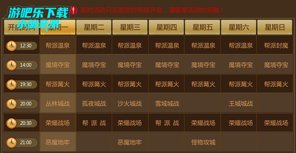 帮派温泉、帮派篝火、帮派押镖、魔魂塔、魔镜夺宝(使用双倍经验卡经验奖励更高)、恶魔地牢(周一和周五开启)、五城城战活动都有大量经验奖励。