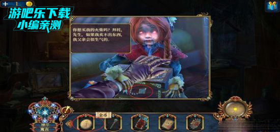 进入火柴店,点右边的桌子,打开盒子,得到火柴店标志。
